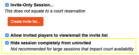 Premium and Power Users now have the ability to completely hide their invite-only sessions from those not invited. We recommend you only use this option for smaller sessions, and not large ones that will impact court availability for other players. (One of the things that makes the site useful is being able to tell which locations are going to be busier than others on a given day.) If you have a private residential court, we can permanently set this up at the location level, as well as hide your location from the public map. Contact us for assistance with setting up private residential courts.