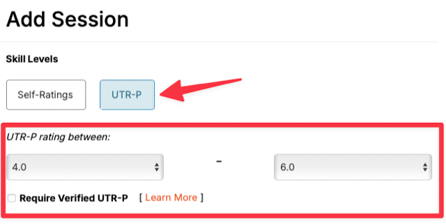Under the Add Session screen, you will notice there are now two options for defining your session’s skill level range – Self-Ratings and UTR-P. When you choose to create a UTR-P based session, players must have a matching decimal rating in order to join your session. You can also choose whether to restrict to only verified UTR-P Ratings (those calculated based on organized/sanctioned play) vs. unverified ratings (which also include casual play and pick-up games).