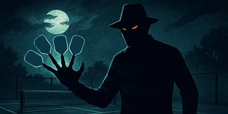 Only this time, his signature glove doesn't have blades — he’s rocking pickleball paddle fingers! Just think about Freddy as your doubles partner. Terrifying, sure… but imagine his coverage at the kitchen line!