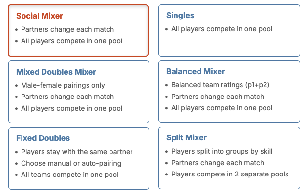 Maybe you’re organizing a focused drill session, setting up singles play, or hosting a clinic or lesson — choosing the right format lets players know exactly what they’re signing up for before they join. That clarity usually means better turnout, fewer questions, and a better experience on the courts.